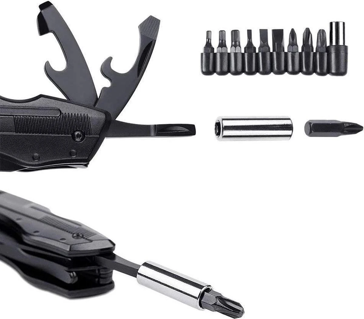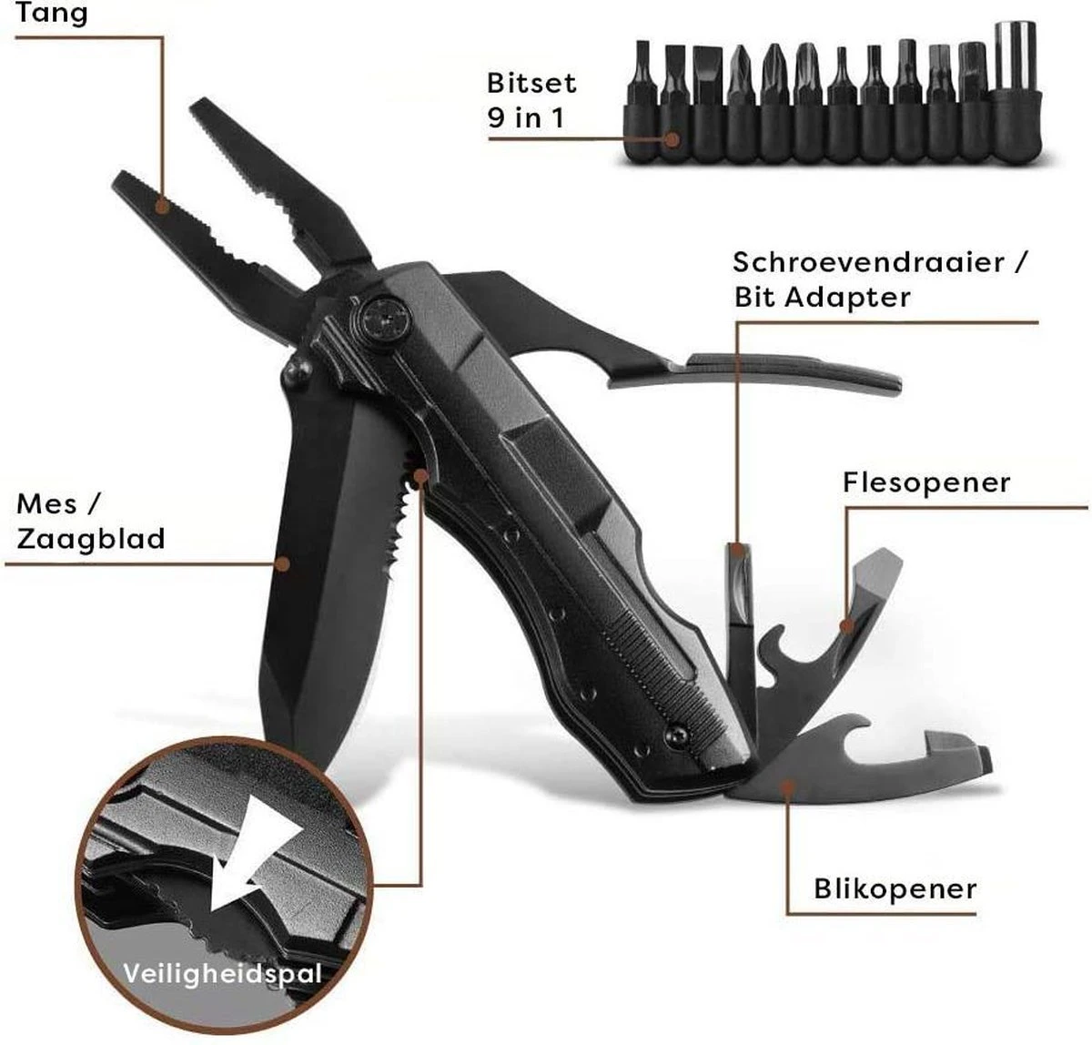 - 14 functies: een groot mes, zaagblad, tang, schroevendraaier met 9-delige bitset, fles- en blikopener.
