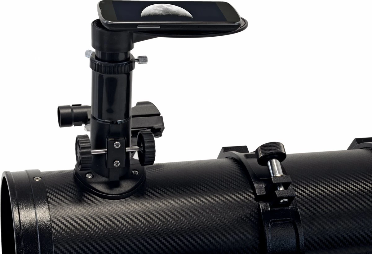 De Bresser Pluto telescoop 114/500 is de perfecte combinatie van een grote Newton Spiegel (ook wel een reflector telescoop genoemd) met een korte brandpuntsafstand. De meer ervaren astronoom zal weten dat lichtinval een belangrijkere factor is dan vergroting. Veel mensen zullen de grote 114 mm spiegel op prijs stellen. Hiermee kan een significante hoeveelheid aan licht worden verzameld en gereflecteerd. U zult met gemak in staat zijn om ver gelegen objecten in het zonnestelsel te onderscheiden. De 114 mm opening en de korte brandpuntsafstand van 500 mm geven deze OTA (Optical Tube Assembly) een focal ratio van f/4,4. De parallactische montering stelt de gebruiker in staat om de objecten aan de nachthemel met gemak te volgen. De EQ montering is sterk en degelijk. Door de mooie carbon look van de OTA (Optical Tube Assembly) ziet de kijker er ook nog eens erg professioneel uit. Met de meegeleverde smartphone camera adapter kan men eenvoudig een foto maken van helder objecten zoals de maan. Door gebruik te maken van de meegeleverde barlowlens kan men grotere vergrotingen behalen. Het brandpunt van de telescoop zal dan verdriedubbeld worden. Erg handig om onze maan en planeten te bekijken. Let wel op! De kijker wordt door het gebruik van een barlowlens minder lichtsterk. Vandaar dat geadviseerd wordt een barlowlens alleen te gebruiken voor zeer heldere objecten zoals de maan en planeten. De telescoop wordt geleverd met een hoogwaardig zonnefilter voor veilige observatie van bijvoorbeeld zonnevlekken.
