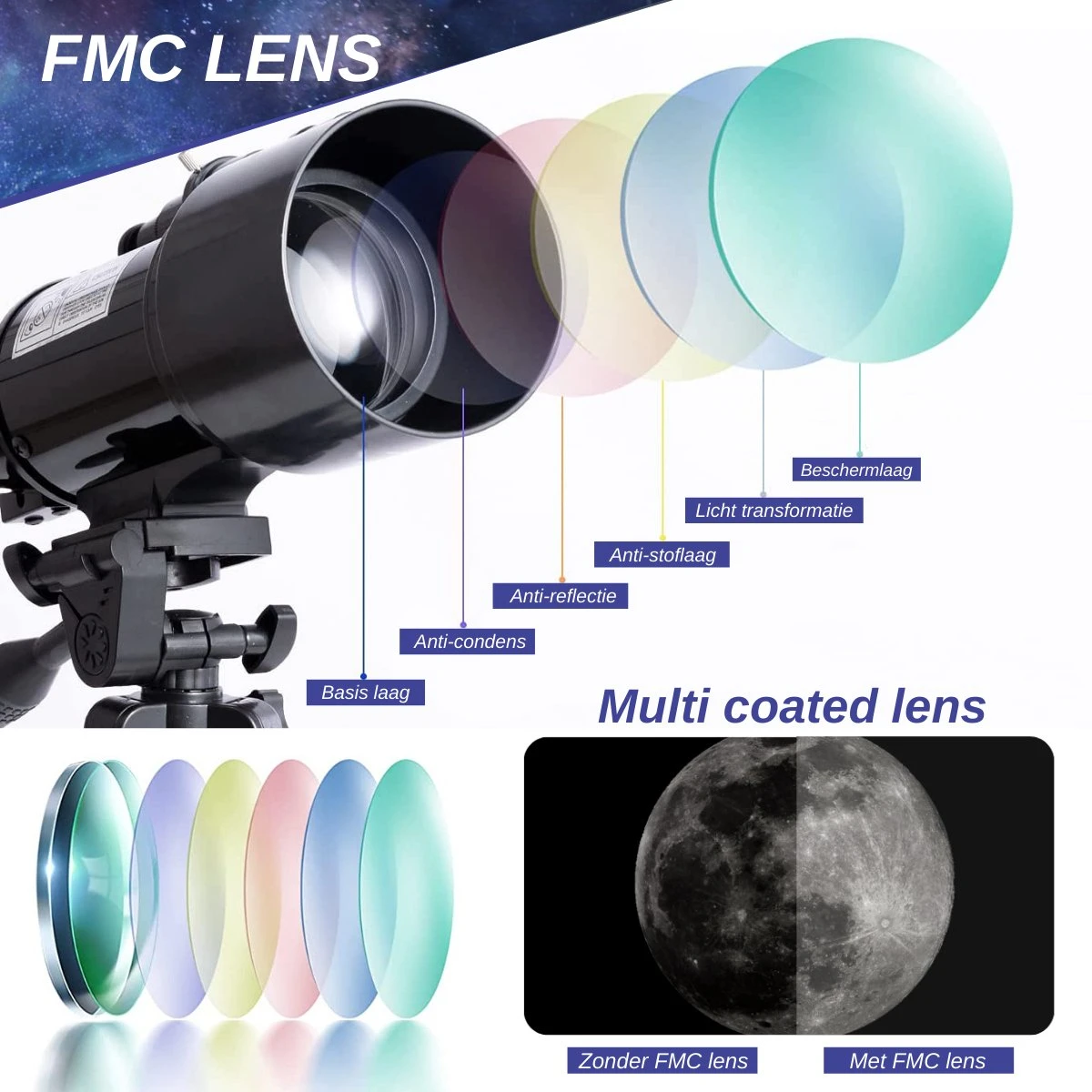 De CAMUX telescoop is uitgerust met 400 mm brandpuntsafstand, een 70 mm diameter lens en een Barlow lens van 3x vergroting om verbluffende beelden te kunnen zien. Verder beschikt de telescoop over hoogwaardige, volledig FMC gecoate lenzen die het beeld verbeteren en je ogen goed beschermen.