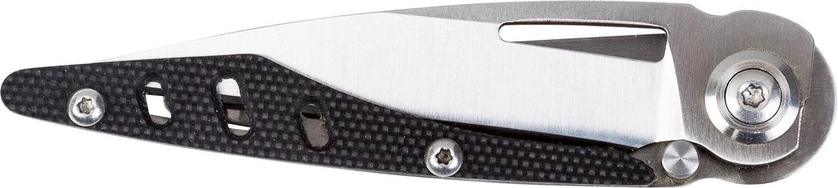 Specificaties: Dit lichtgewicht pocketmes is door de uitsparing in het lemmet gemakkelijk uit te klappen. Met de framelock-blokkering klikt het lemmet veilig vast en na ontgrendeling is het mes met één hand dicht te klappen. Het lemmet is van 8 Cr 13 Mo V roestvrij molybdeenstaal, is vlijmscherp en heeft een spitse punt voor het fijnere snijwerk. De heftschaal is van sterk G10 materiaal en bevestigd op een roestvrij stalen frame.