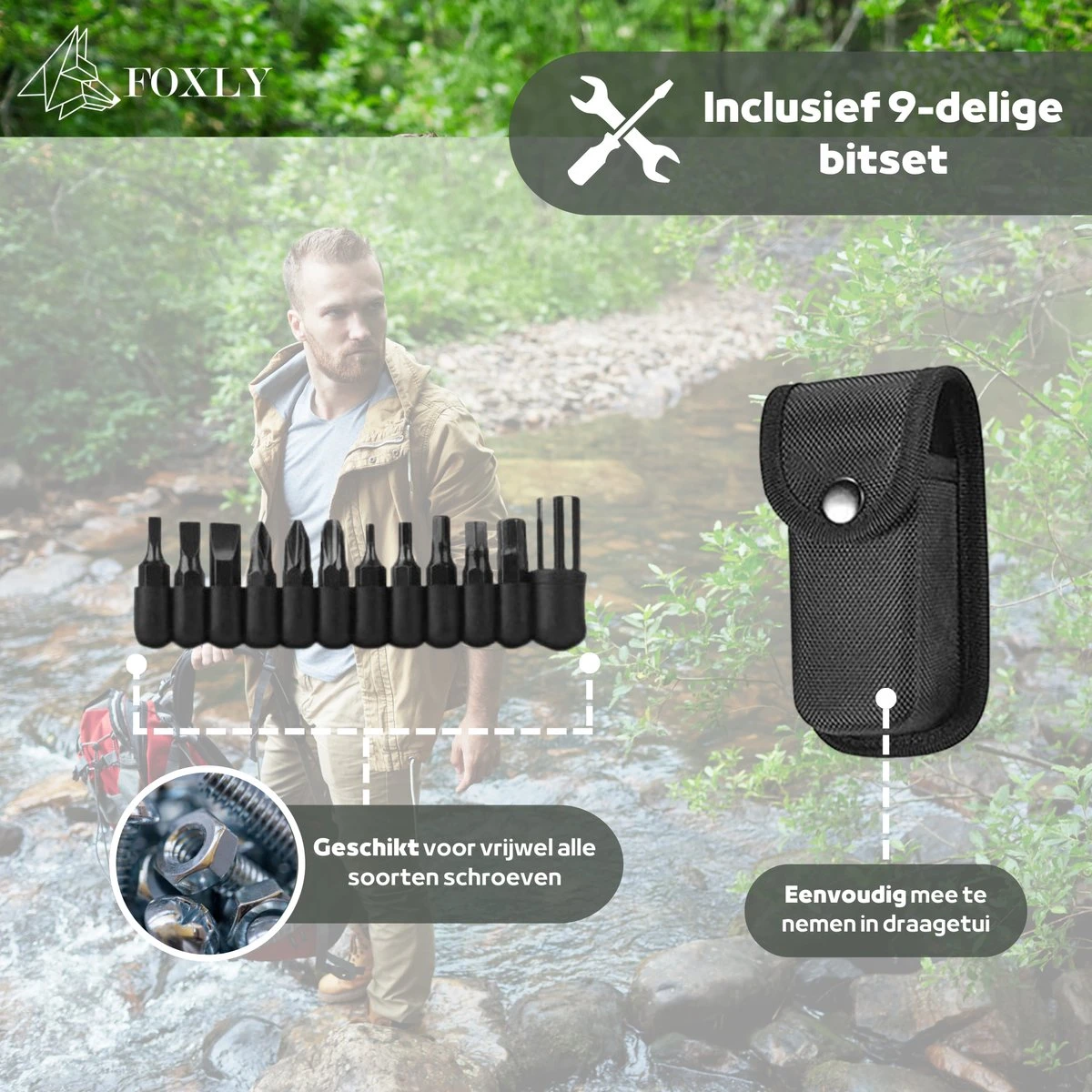 Inhoud Verpakking: 1 x FOXLY Multifunctioneel zakmes + Draagetui + 9-delige Bitset