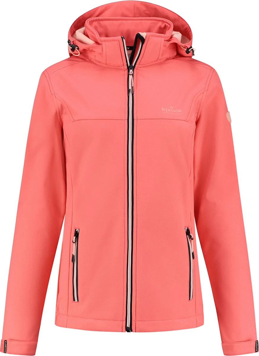 Kjelvik softshell jas Merel is een ademende en waterafstotende jas voor dames. Deze sportieve jas is gemaakt van een soepele 4-way stretch softshell kwaliteit met een polarfleece binnenzijde. De jas heeft een afneembare capuchon, twee steekzakken met ritssluiting en verstelbare manchetten.