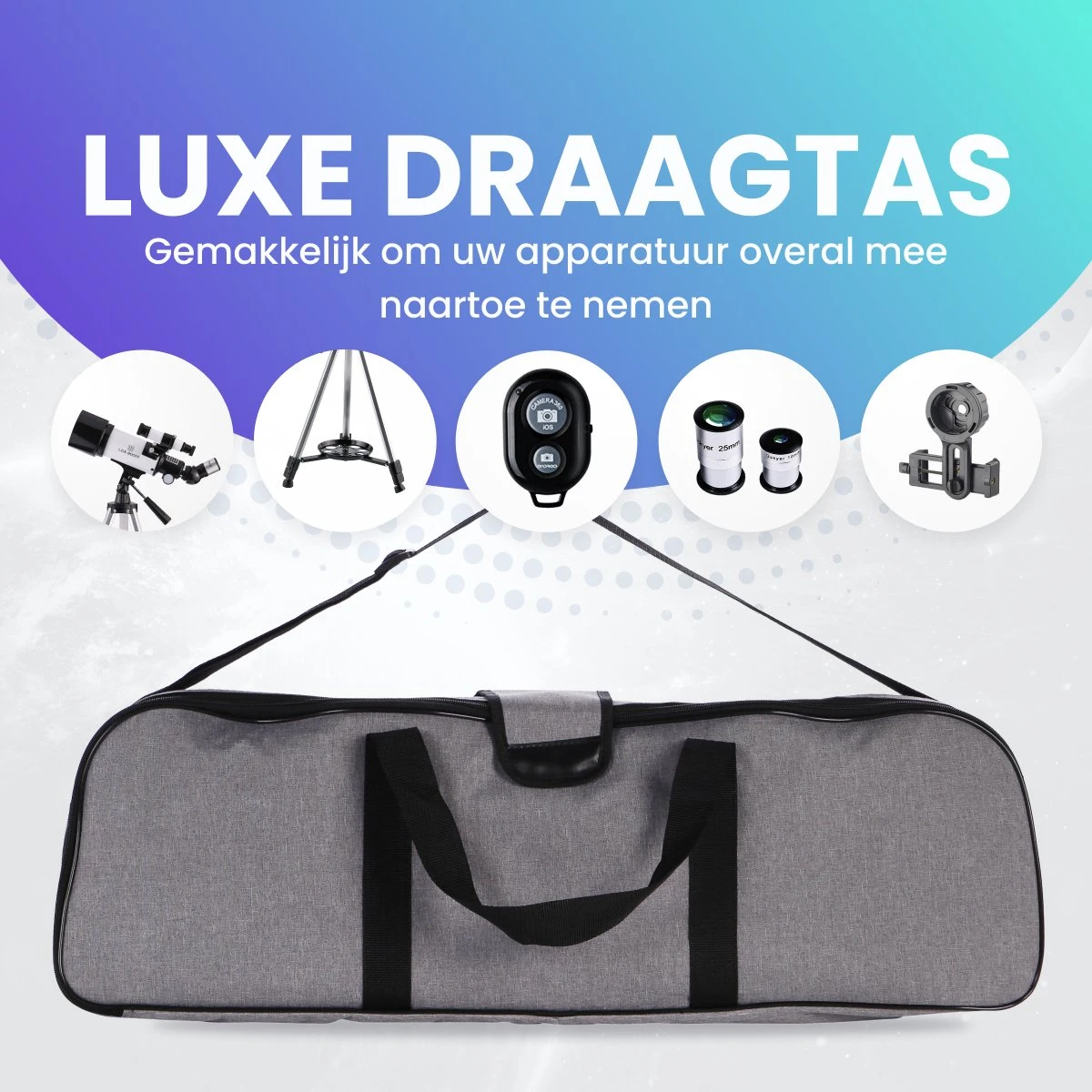 Van jong tot oud, van beginner tot gevorderde voor deze luxe telescoop is het geen probleem. Door de extra meegeleverde lenzen is geen planeet meer te ver! Neem de telescoop gemakkelijk mee op reis of bekijk de mooiste landschappen en dieren in jouw eigen leefomgeving en maak schitterende foto’s door middel van de telefoonhouder!