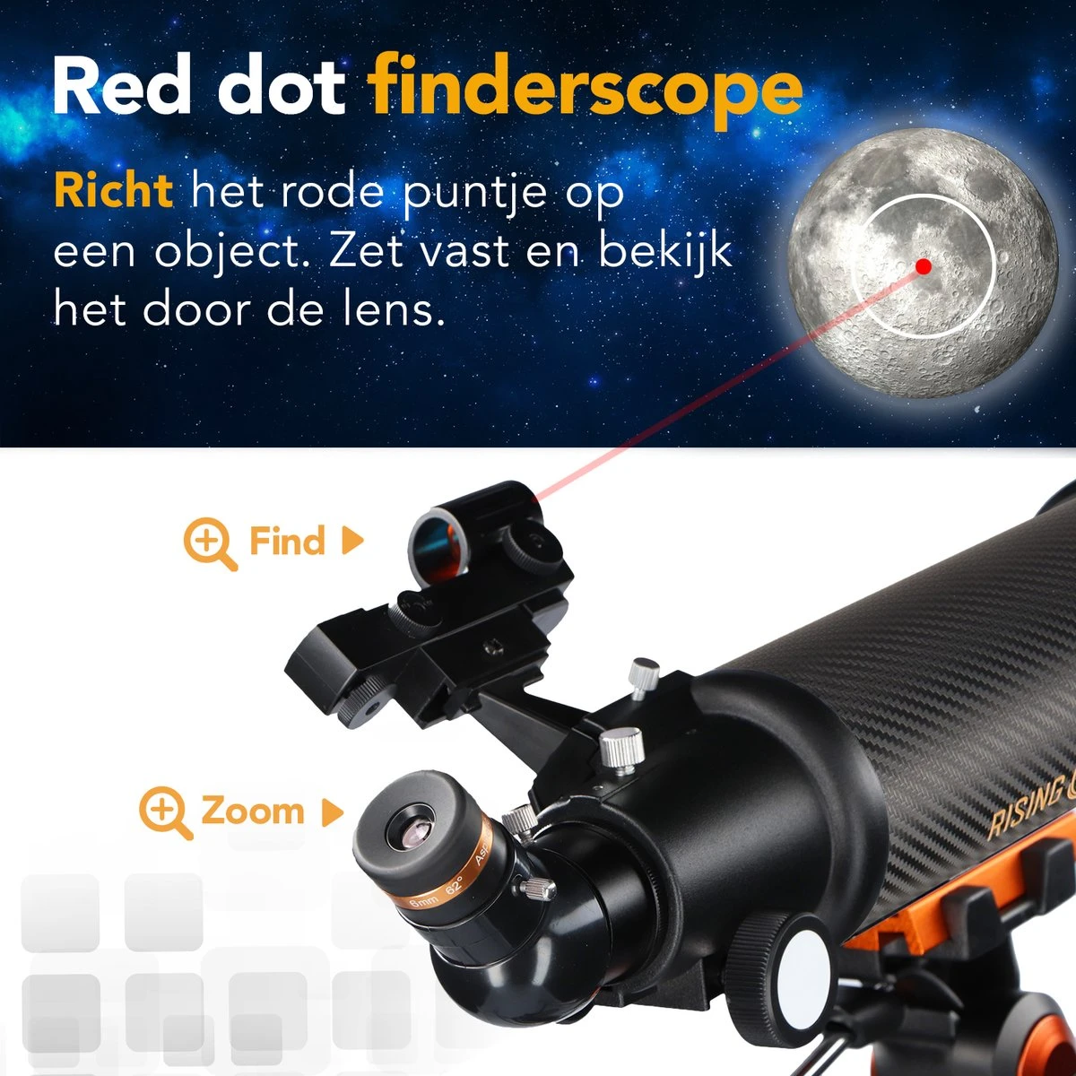 Iedereen is enthousiast over de wonderen van het heelal. Deze telescoop beschikt over een red dot scope waardoor het nog makkelijker wordt om het heelal te bekijken. Richt het rode puntje op een object en zet het statief vast. Bestudeer het object daarna door het oculair.