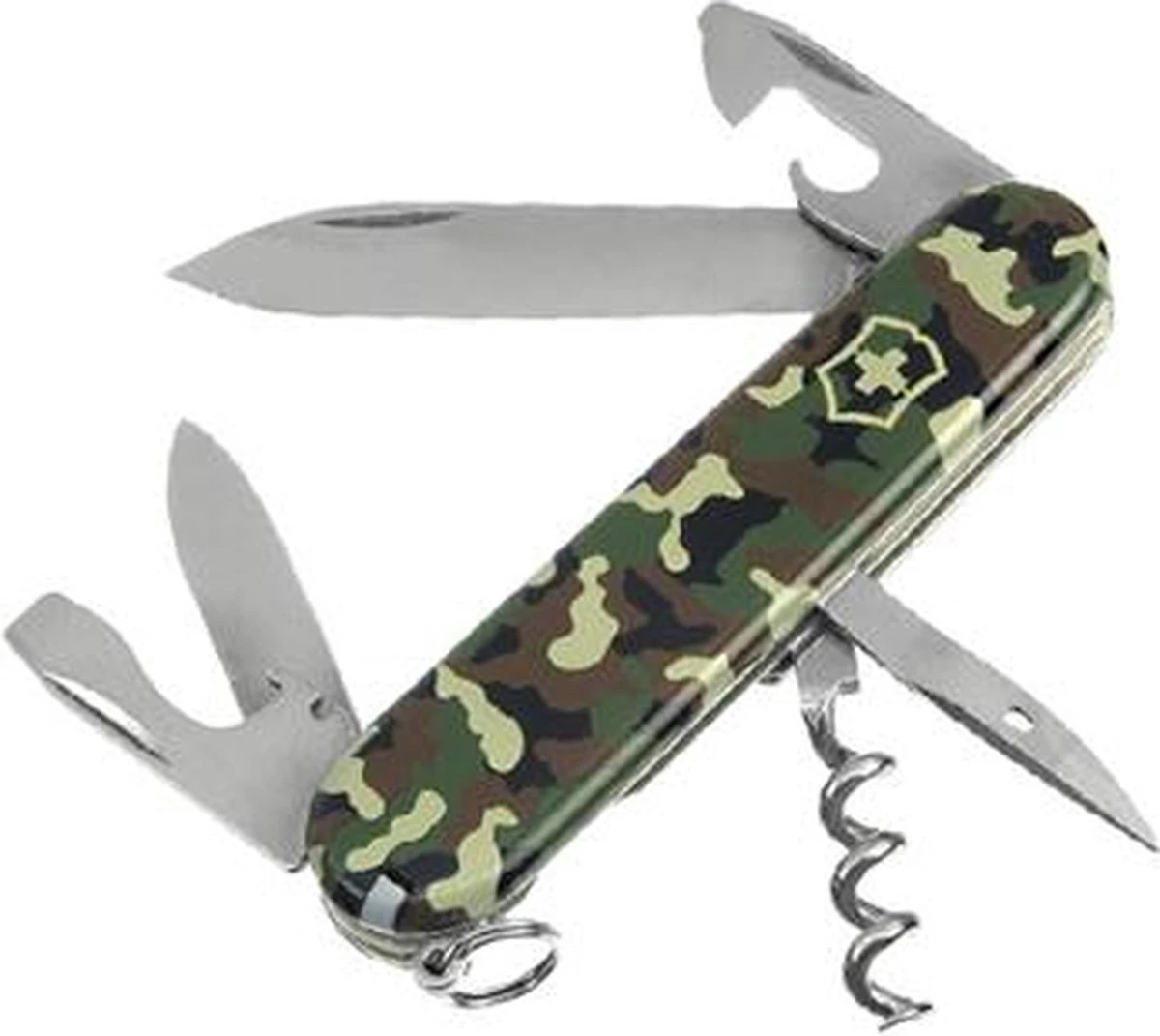 Victorinox Original Swiss Army Spartan zakmes met gladde beschaling met camouflage dessin. Alle onderdelen zijn van roestvrij staal. Dit zakmes van superieure Zwitserse kwaliteit heeft de volgende 12 functies: groot mes, klein mes, kurkentrekker, blikopener met kleine schroevendraaier (ook voor kruiskopschroeven), flesopener met schroevendraaier en draadstripper, boorpriem, sleutelring, pincet en tandenstoker.