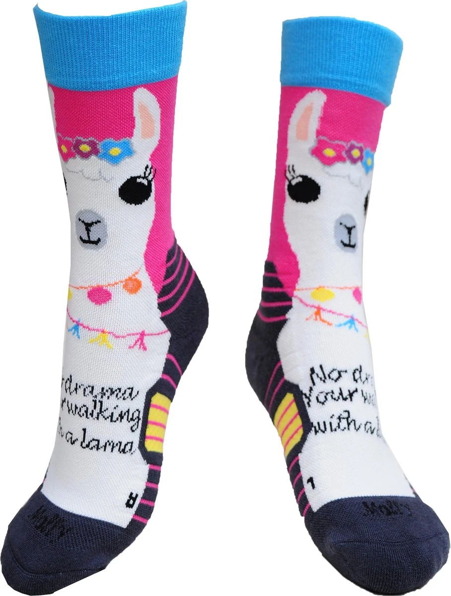 “No drama your walking with a lama” met zo’n leuke tekst en lama op je sokken gaat het wandelen natuurlijk helemaal vanzelf! Wordt je nou echt blij van het wandelen dan mogen deze vrolijke sokken zeker niet ontbreken in jouw sokkencollectie.