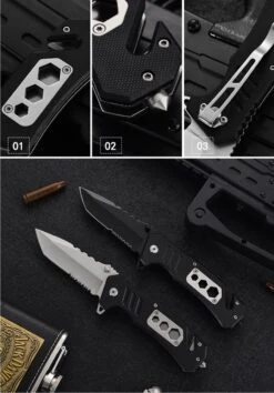 Sefaras Survival Zakmes J03 – Mes Met Tanden – 3cr13/Aluminum – Met 3 Inbus Gaten – Inklapbaar – Broekclip – Voor Kamperen – RVS – Zwart/Wit